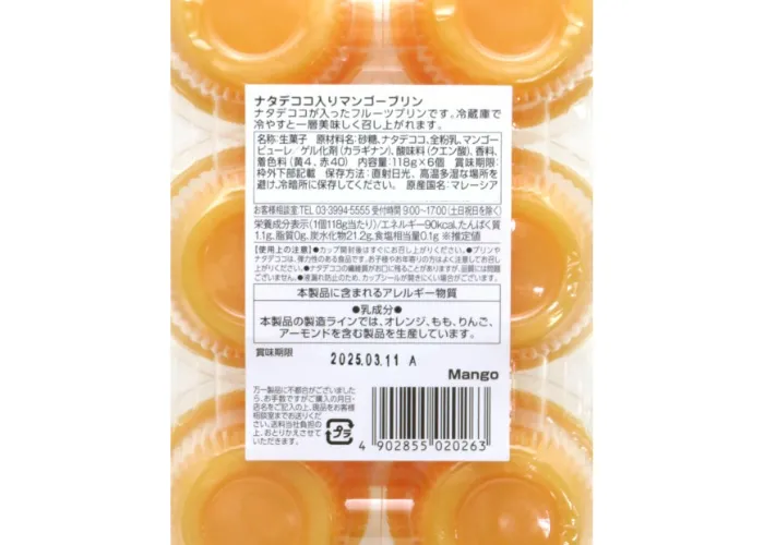 | 原材料名 | 砂糖、ナタデココ、全粉乳、マンゴービューレ/ゲル化剤(カラギナン)、酸味料(クエン酸)、香料、着色料(黄4・赤40) |
