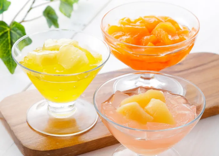 | 栄養成分表示「推定値」 | (1個(90g)当たり)【夕張メロンゼリー】熱量70kcal、たんぱく質0.2g、脂質0g、炭水化物17.1g、食塩相当量0.06g【パインゼリー】熱量74kcal、たんぱく質0.1g、脂質0g、炭水化物18.5g、食塩相当量0.2g【白桃ゼリー】熱量64kcal、たんぱく質0.1g、脂質0g、炭水化物16.4g、食塩相当量0.1g |