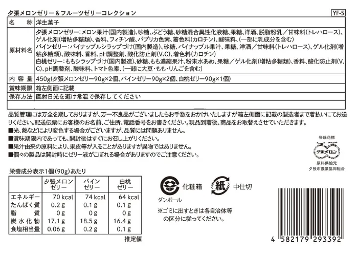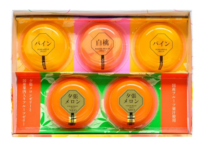 | 1個サイズ(入数)/寸法 | 90g/5個(夕張メロンゼリー×2、パインゼリー×2、白桃ゼリー×1)/- |