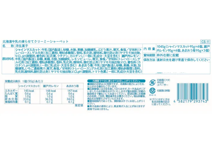 | 栄養成分表示「推定値」 | (1個(95g)当たり)【シャインマスカット】熱量145kcal、たんぱく質0.6g、脂質1.0g、炭水化物33.6g、食塩相当量0.1g【瀬戸内レモン】熱量148kcal、たんぱく質0.6g、脂質1.0g、炭水化物34.3g、食塩相当量0.1g【あまおう苺】熱量147kcal、たんぱく質0.6g、脂質1.0g、炭水化物34.0g、食塩相当量0.1g |