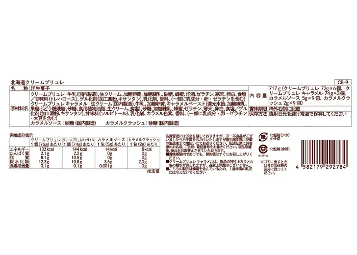| 1個サイズ(入数)/寸法 | クリームブリュレ:72g、クリームブリュレキャラメル:74g、カラメルソース:5g、カラメルクラッシュ:2g/9個(クリームブリュレ×6、クリームブリュレキャラメル×3、カラメルソース×9、カラメルクラッシュ×9)/- |