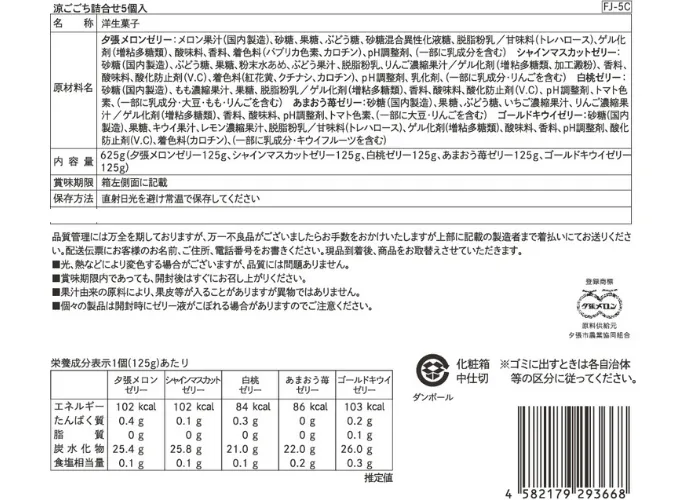 | 原材料名 | 【夕張メロンゼリー】メロン果汁(国内製造)、砂糖、果糖、ぶどう糖、砂糖混合異性化液糖、脱脂粉乳/甘味料(トレハロース)、ゲル化剤(増粘多糖類)、酸味料、香料、着色料(パプリカ色素、カロチン)、pH調整剤、(一部に乳成分を含む)【シャインマスカットゼリー】砂糖(国内製造)、ぶどう糖、果糖、粉末水あめ、ぶどう果汁、脱脂粉乳、りんご濃縮果汁/ゲル化剤(増粘多糖類、加工澱粉)、香料、酸味料、酸化防止剤(V.C)、着色料(紅花黄、クチナシ、カロチン)、pH調整剤、乳化剤、(一部に乳成分・りんごを含む)【白桃ゼリー】砂糖(国内製造)、もも濃縮果汁、果糖、脱脂粉乳/ゲル化剤(増粘多糖類)、香料、酸味料、酸化防止剤(V.C)、pH調整剤、トマト色素、(一部に乳成分・大豆・もも・りんごを含む)【あまおう苺ゼリー】砂糖(国内製造)、果糖、ぶどう糖、いちご濃縮果汁、りんご濃縮果汁/ゲル化剤(増粘多糖類)、香料、酸味料、pH調整剤、トマト色素、(一部に大豆・りんごを含む)【ゴールドキウイゼリー】砂糖(国内製造)、果糖、キウイ果汁、レモン濃縮果汁、脱脂粉乳/甘味料(トレハロース)、ゲル化剤(増粘多糖類)、酸味料、香料、pH調整剤、酸化防止剤(V.C)、着色料(カロチン)、(一部に乳成分・キウイフルーツを含む) |