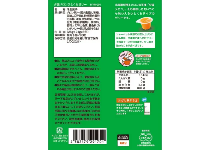 | 原材料名 | メロン果汁(国内製造)、砂糖、果糖、ぶどう糖、砂糖混合異性化液糖、洋酒、脱脂粉乳/ゲル化剤(増粘多糖類)、酸味料、香料、パプリカ色素、着色料(カロチン)、(一部に乳成分を含む) |