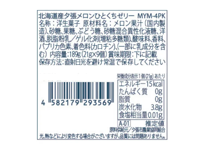 | 原材料名 | メロン果汁(国内製造)、砂糖、果糖、ぶどう糖、砂糖混合異性化液糖、洋酒、脱脂粉乳/ゲル化剤(増粘多糖類)、酸味料、香料、パプリカ色素、着色料(カロチン)、(一部に乳成分を含む) |