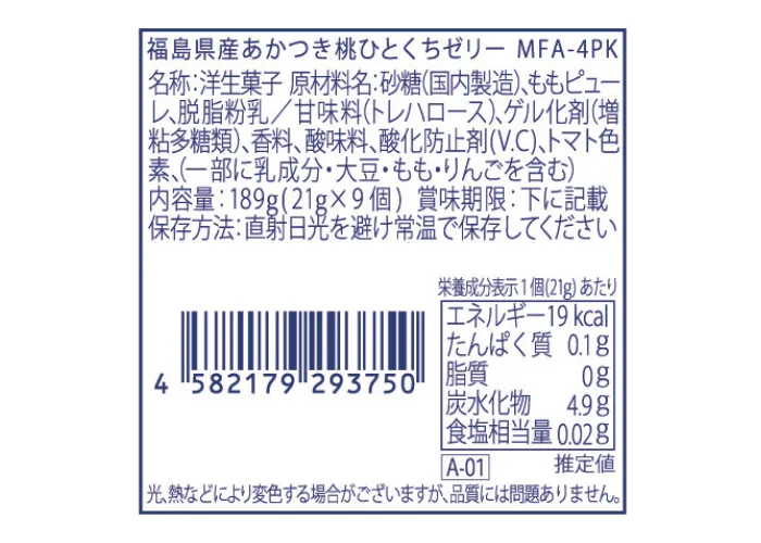 | 原材料名 | 砂糖(国内製造)、ももピューレ、脱脂粉乳/甘味料(トレハロース)、ゲル化剤(増粘多糖類)、香料、酸味料、酸化防止剤(V.C)、トマト色素、(一部に乳成分・大豆・もも・りんごを含む) |