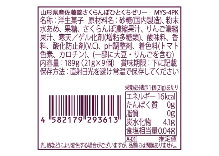 | 原材料名 | 砂糖(国内製造)、粉末水あめ、果糖、さくらんぼ濃縮果汁、りんご濃縮果汁、寒天/ゲル化剤(増粘多糖類)、酸味料、香料、酸化防止剤(V.C)、pH調整剤、着色料(トマト色素、カロチン)、(一部に大豆・りんごを含む) |