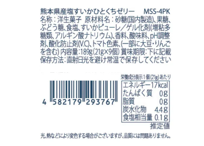 | 原材料名 | 砂糖(国内製造)、果糖、ぶどう糖、食塩、すいかピューレ/ゲル化剤(増粘多糖類、アルギン酸ナトリウム)、香料、酸味料、pH調整剤、酸化防止剤(V.C)、トマト色素、(一部に大豆・りんごを含む) |