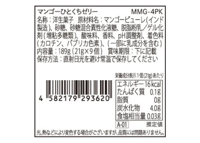 | 原材料名 | マンゴーピューレ(インド製造)、砂糖、砂糖混合異性化液糖、脱脂粉乳/ゲル化剤(増粘多糖類)、酸味料、香料、pH調整剤、着色料(カロチン、パプリカ色素)、(一部に乳成分を含む) |