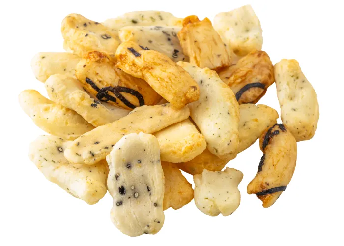 国産有機栽培もち米をパリッと食感に焼き上げました。胡麻・海老・海苔・アオサの4種を自社特製醤油出汁で味付けしました。「焼き(加熱)」と「冷まし」を繰り返す独自の「びっくり焼き」製法で焼き上げています。