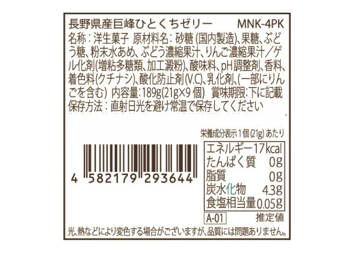 | 原材料名 | 砂糖(国内製造)、果糖、ぶどう糖、粉末水あめ、ぶどう濃縮果汁、りんご濃縮果汁/ゲル化剤(増粘多糖類、加工澱粉)、酸味料、pH調整剤、香料、着色料(クチナシ)、酸化防止剤(V.C)、乳化剤、(一部にりんごを含む) |