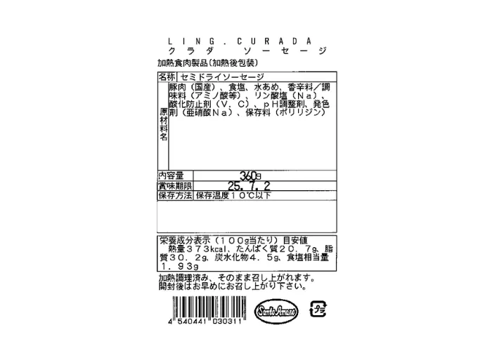 | 原材料名 | 豚肉(国産)、食塩、水あめ、香辛料/調味料(アミノ酸等),リン酸塩(Na)、酸化防止剤(V.C)、pH調整剤、、発色剤(亜硝酸Na)、保存料(ポリリジン) |