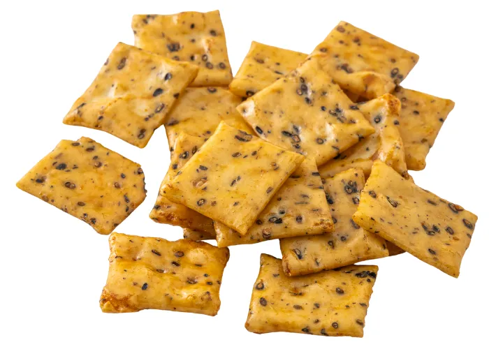 国産もち米使用。胡麻を生地につき込んだ、上品な甘さのパリパリ焼きおかきです。胡麻の香ばしさが人気のロングセラーおかき。有機醤油をベースに、かつお節と昆布のだしで旨味を出しています。