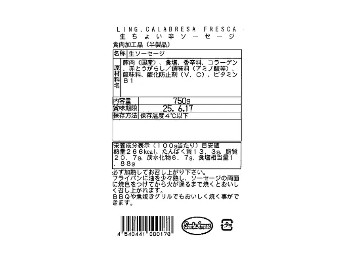 | 原材料名 | 豚肉(国産)、食塩、香辛料、コラーゲン、赤とうがらし/調味料(アミノ酸等)、酸味料、酸化防止剤(V.C)、ビタミンB1 |