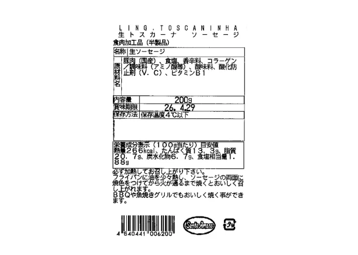 | 原材料名 | 豚肉(国産)、食塩、香辛料、コラーゲン/調味料(アミノ酸等)、酸味料、酸化防止剤(V.C)、ビタミンB1 |