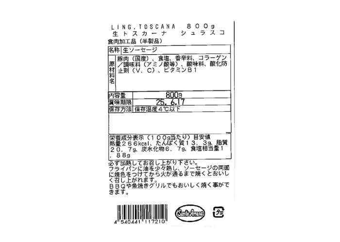 | 原材料名 | 豚肉(国産)、食塩、香辛料、コラーゲン/調味料(アミノ酸等)、酸味料、酸化防止剤(V.C)、ビタミンB1 |