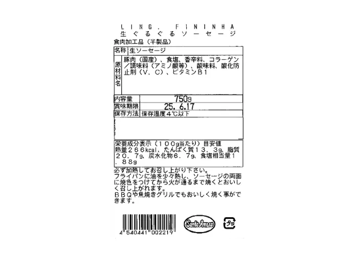 | 原材料名 | 豚肉(国産)、食塩、香辛料、コラーゲン/調味料(アミノ酸等)、酸味料、酸化防止剤(V.C)、ビタミンB1 |