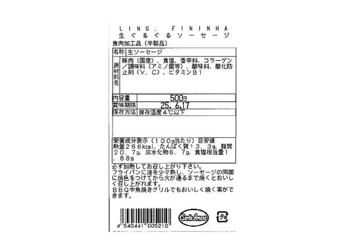 | 原材料名 | 豚肉(国産)、食塩、香辛料、コラーゲン/調味料(アミノ酸等)、酸味料、酸化防止剤(V.C)、ビタミンB1 |