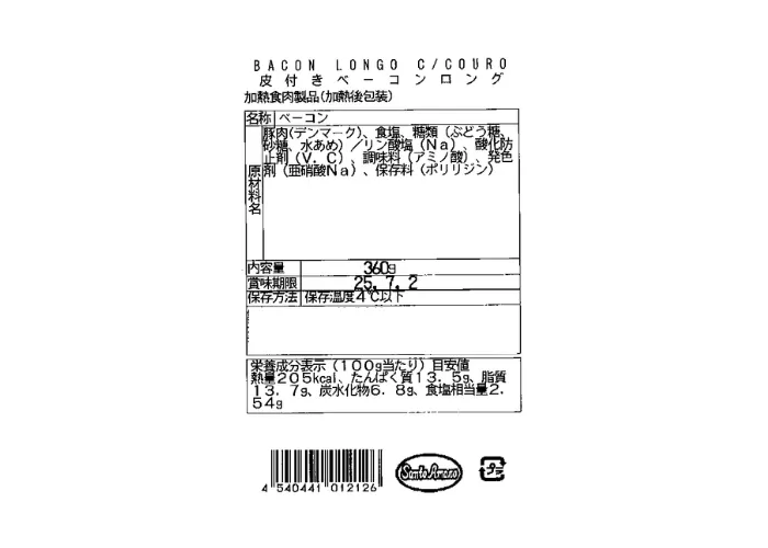 | 原材料名 | 豚肉(スペイン)、食塩、糖類(ぶどう糖、砂糖、水あめ)/リン酸塩(Na)、酸化防止剤(V.C)、調味料(アミノ酸)、発色剤(亜硝酸Na)、保存料(ポリリジン) |