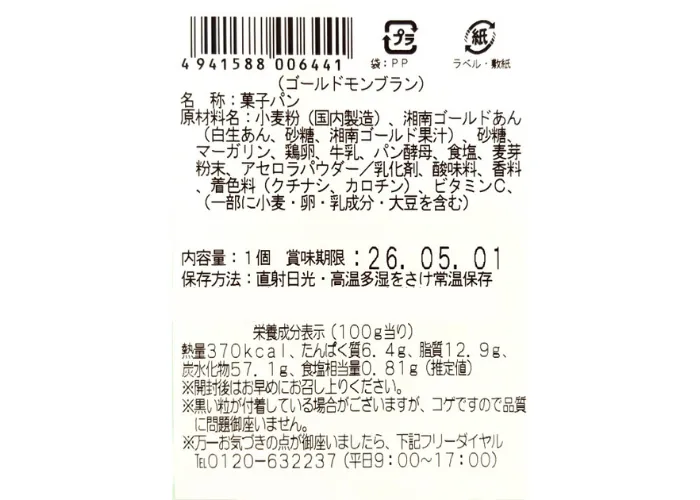 | 原材料名 | 小麦粉(国内製造)、湘南ゴールドあん(白生あん、砂糖、湘南ゴールド果汁)、砂糖、マーガリン、鶏卵、牛乳、パン酵母、食塩、麦芽粉末、アセロラパウダー/乳化剤、酸味料、香料、着色料(クチナシ、カロチン)、ビタミンC、(一部に小麦・卵・乳成分・大豆を含む) |