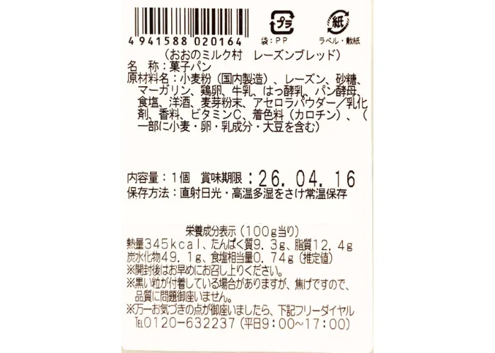 | 原材料名 | 小麦粉(国内製造)、レーズン、砂糖、マーガリン、鶏卵、牛乳、はっ酵乳、パン酵母、食塩、洋酒、麦芽粉末、アセロラパウダー/乳化剤、香料、ビタミンC、着色料(カロチン)、(一部に小麦・卵・乳成分・大豆を含む) |