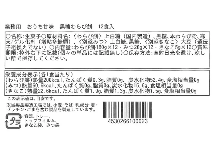 | 原材料名 | 〈わらび餅〉上白糖(国内製造)、黒糖、本わらび粉、寒天/ゲル化剤(増粘多糖類)、〈別添みつ〉上白糖、黒糖、〈別添きなこ〉大豆 |