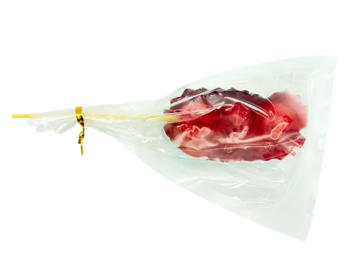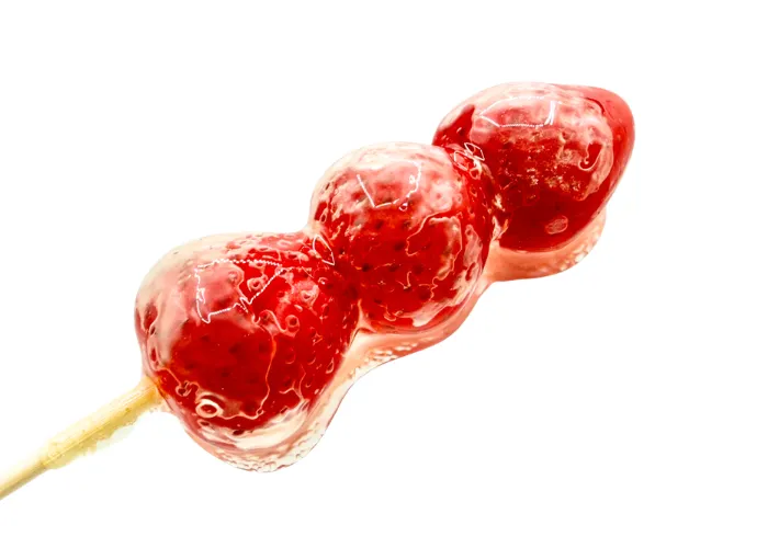 いちごの周りに飴をかけ冷凍しました。解凍せずにそのままお召し上がりください。