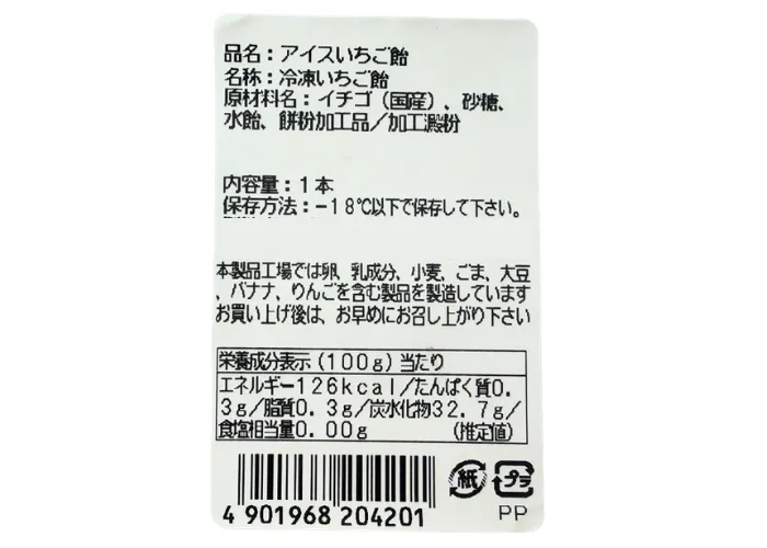 | 原材料名 | イチゴ(国産)、砂糖、水飴、餅粉加工品/加工澱粉 |